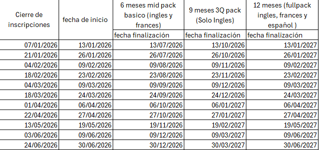 - Francés: Tres módulos: Básico 2, Intermedio 1 y 2, lo anterior dependerá del resultado del test de clasificación.